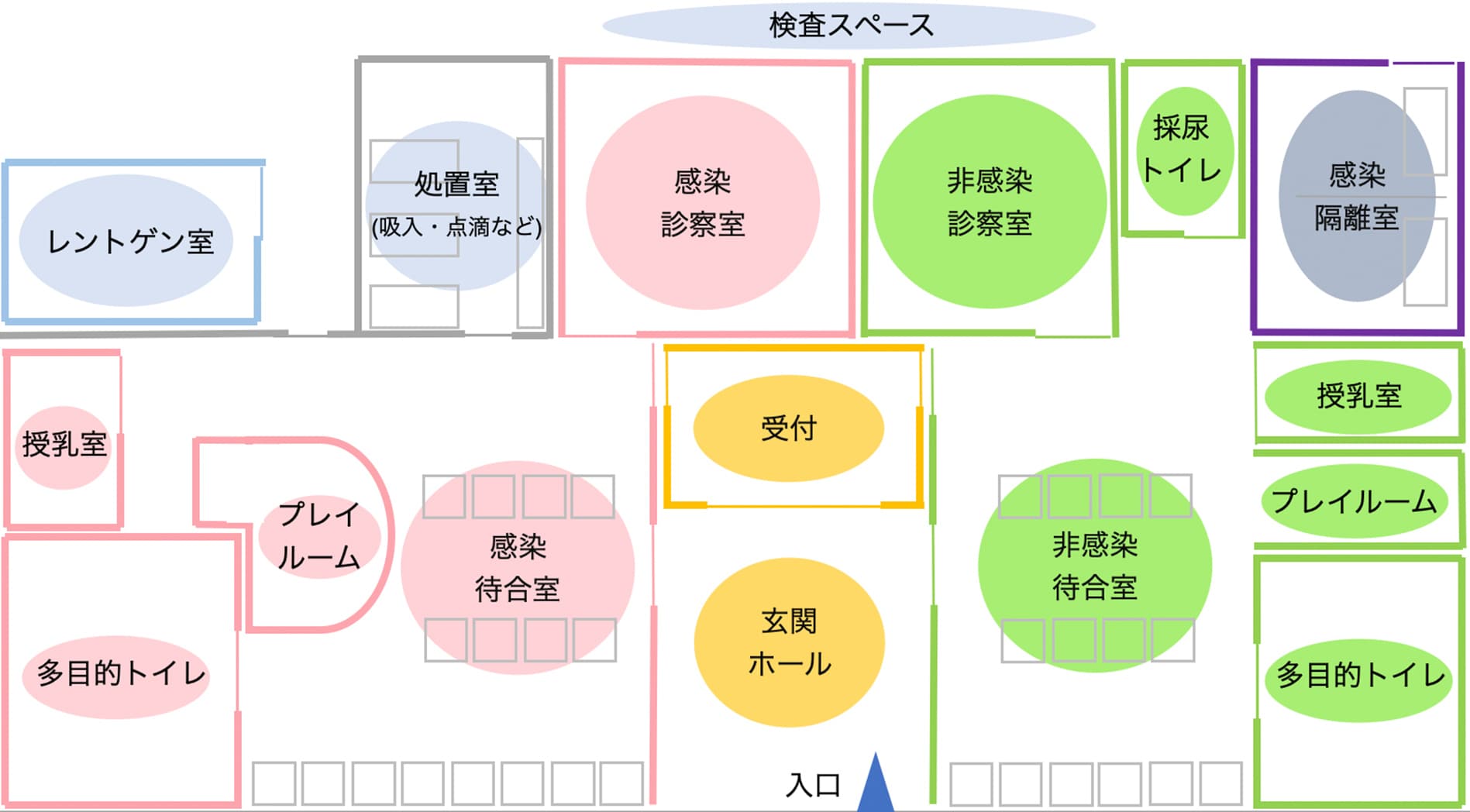 玄関ホール症状により、非感染症待合室(グリーン)・感染症待合室(ピンク)へご案内いたします。