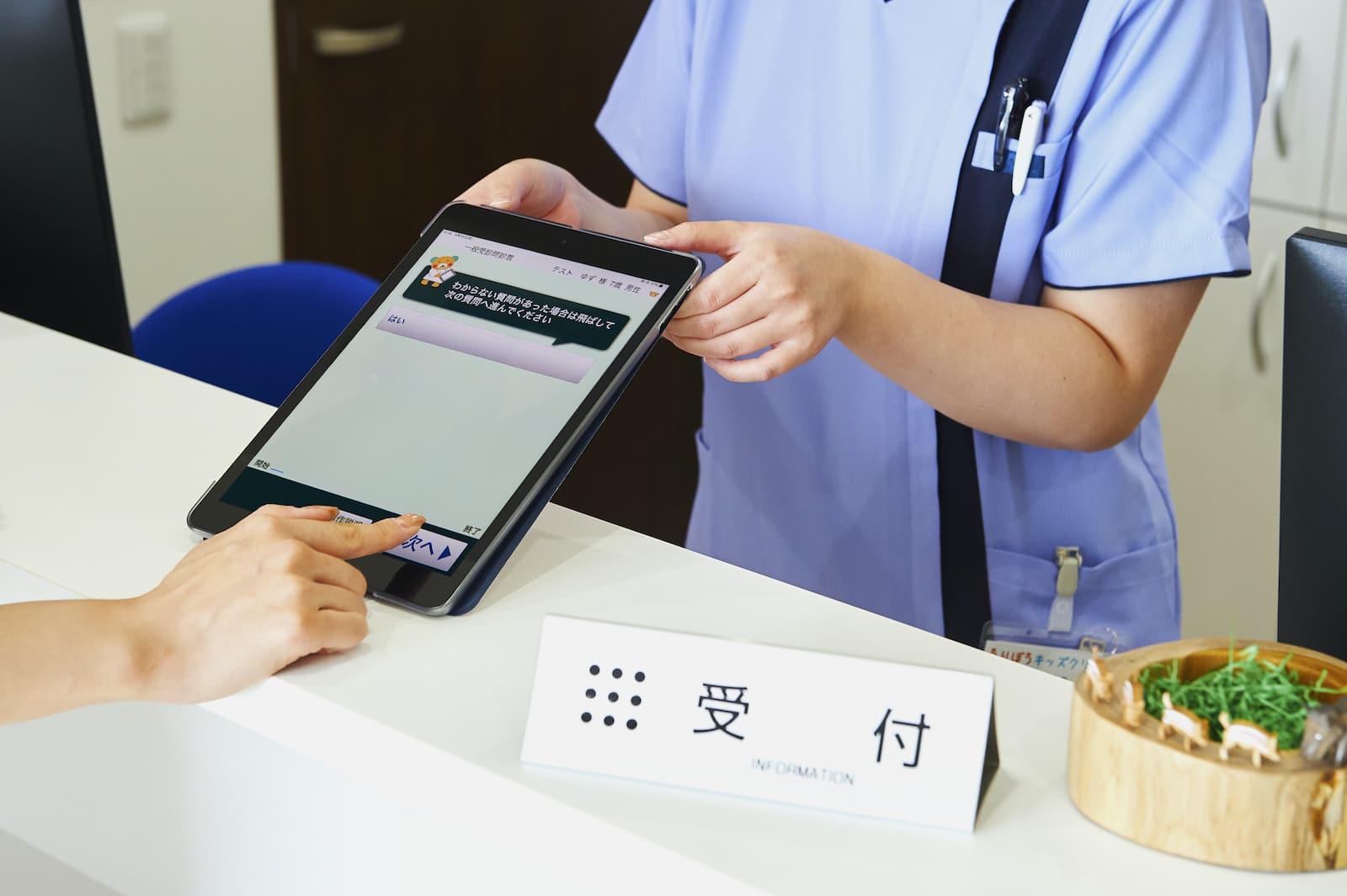 受 付スマホから WEB 問診の事前入力をお願いしております。操作に不慣れな方は受付でスタッフがお手伝い致します。