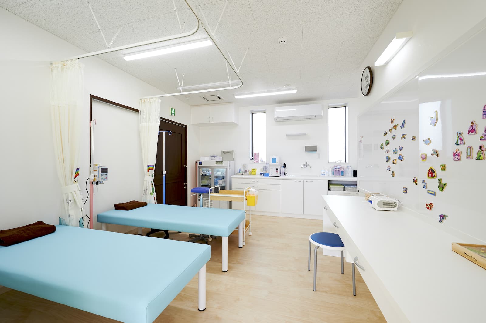 処置室吸入処置中はホワイトボードにマグネットを貼って遊べます。