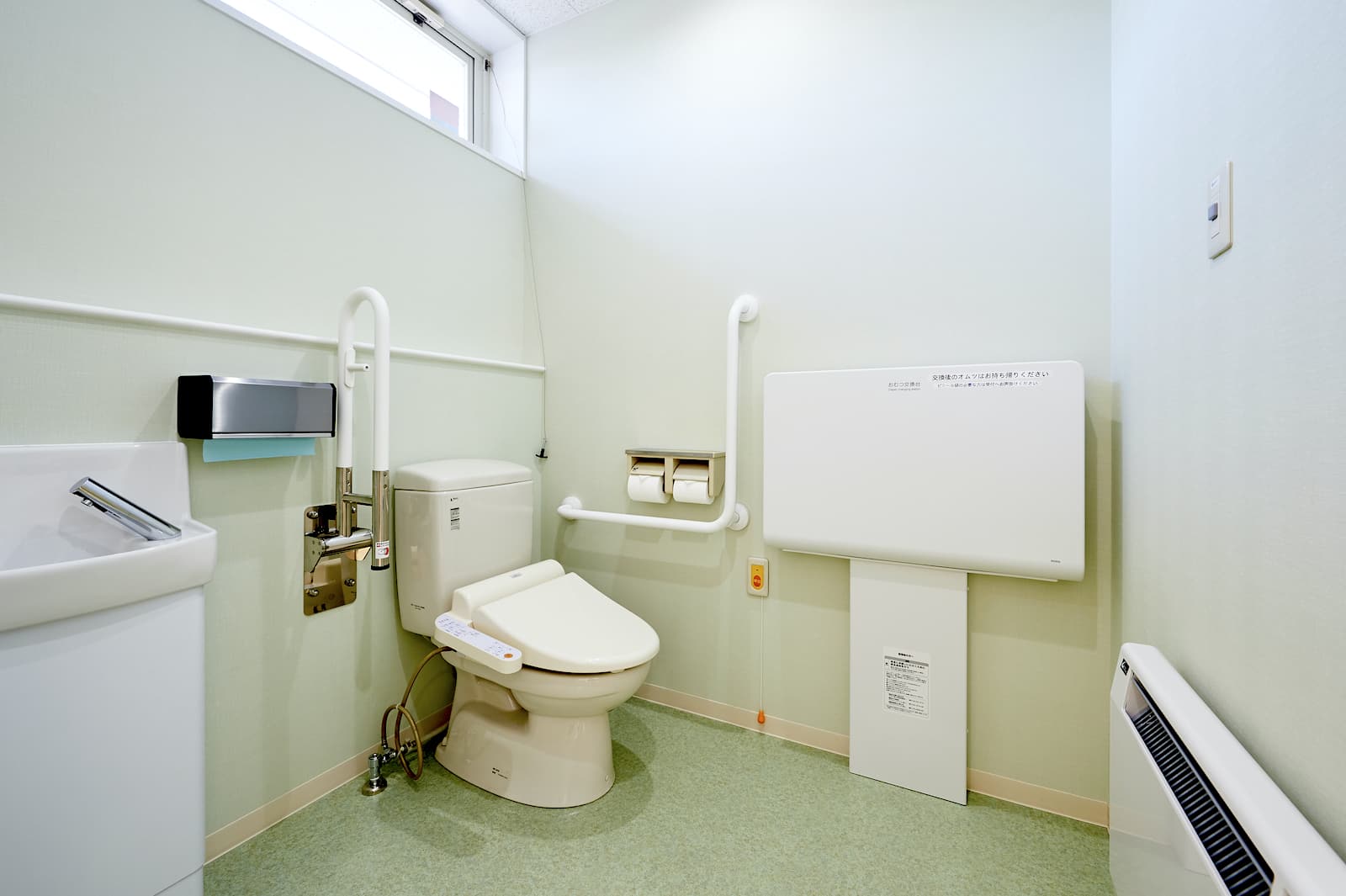 多目的トイレ広々トイレでおむつ交換もできます。